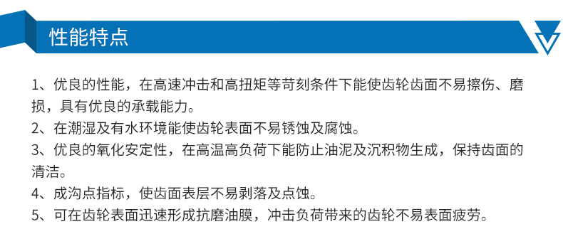 ●优良的抗磨性,在高速冲击和高扭矩等苛刻条件下能有效地防止齿轮齿面的擦伤、磨损,具有优异的承载能力。