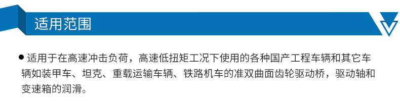 ●适用于在高速冲击负荷,高速低扭矩工况下使用的各种进口、国产工程车辆和其它车辆如装甲车、坦克、重载运输车辆、铁路机车的准双曲面齿轮驱动桥,驱动轴和变速箱的润滑。