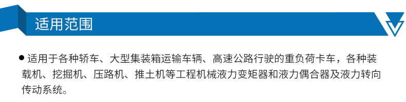 ●适用于各种轿车、大型集装箱运输车辆、高速公路行驶的重负荷卡车,各种装载机、挖掘机、压路机、推土机等工程机械液力变矩器和液力偶合器及液力转向传动系统。