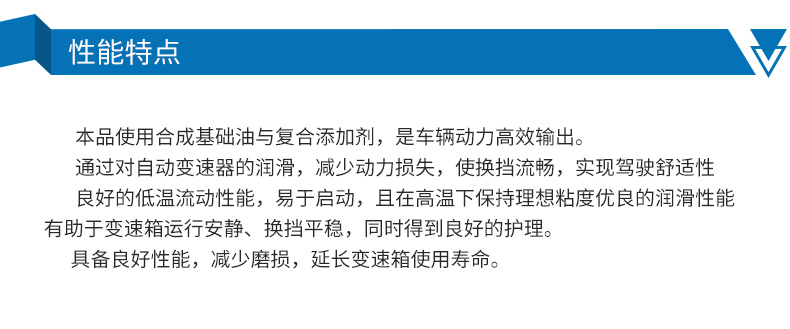 ●本品使用进口合成基础油与进口复合添加剂,使车輛动力输出通过对自动变速器的润滑,减少动力损失,确保换挡流畅,实现驾驶舒适性;具备抗磨保护性能,减少磨损,延长变速箱使用寿命;本品适用于7速车辆,如奔驰于2010年6月21日之后 的7速722.9XX自动变速箱,也可用于宝马、奥迪、大众、路虎等较高要求的6速自动变速箱的乘用车。