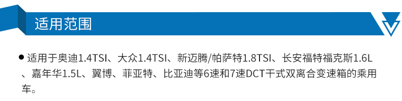 ●本品专为主流车型6速和7速干式双离合变速箱设计,性能超越OEM标准。具有优异的抗磨保护、氧化控制能力和岀色的抗颤抖特性,满足髙扭矩容量,传动平稳,驾驶舒适。适用于进口奥迪14TS、大众1.4TS、新迈腾/新帕萨特1.8TS、长安福特福克斯1.6L,嘉年华1.5、翼博、菲亚特、比亚迪等6速和7速DCT干式双离合箱。