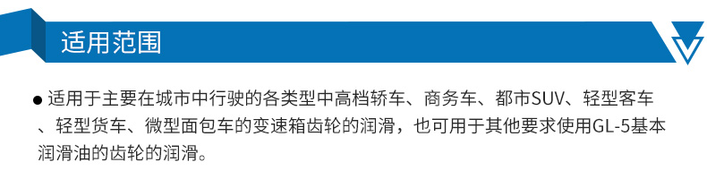 ●适用于主要在城市中行驶的各类型轿车、商务车、都市SUV、轻型客车、轻型货车、微型面包车的变速箱齿轮的润滑,也可用于其它要求使用GL-5级别润滑油的齿轮的润滑。高、低温使用性能和较好的粘温性,满足频繁的起步停车工况下的润滑需求,良好的保护齿轮箱,如大油门起步及急刹车等运行条件;