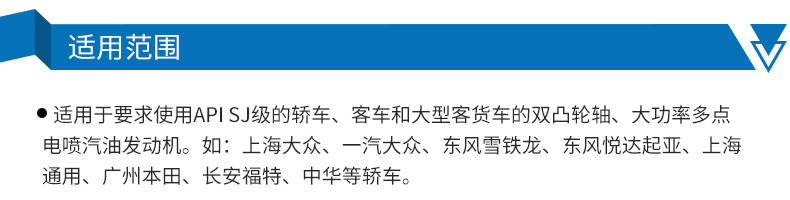 ●适用于要求使用API SJ级的轿车、客车和大型客货车的双凸轮轴、大功率多点电喷汽油发动机。如:上海大众、一汽大众、东风雪铁龙、东风悦达起亚、上海通用、广州本田、长安福特、中华等轿车。