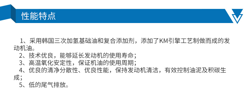 ●采用韩国三次加氢基础油和进口复合添加剂,特别添加了KM引擎工艺精制而成的发动机油。