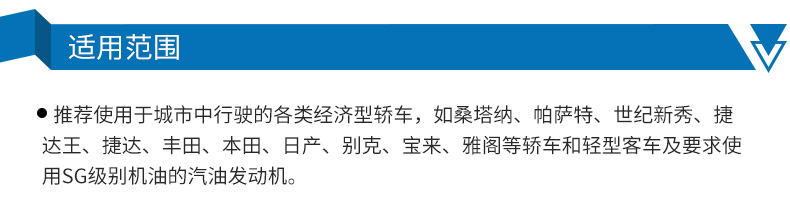 ●推荐使用于城市中行驶的各类经济型轿车,如桑塔纳、帕萨特、世纪新秀、捷达****、捷达、丰田、本田、日产、别克、宝来、雅阁等轿车和轻型客车及要求使用SG级别机油的汽油发动机。